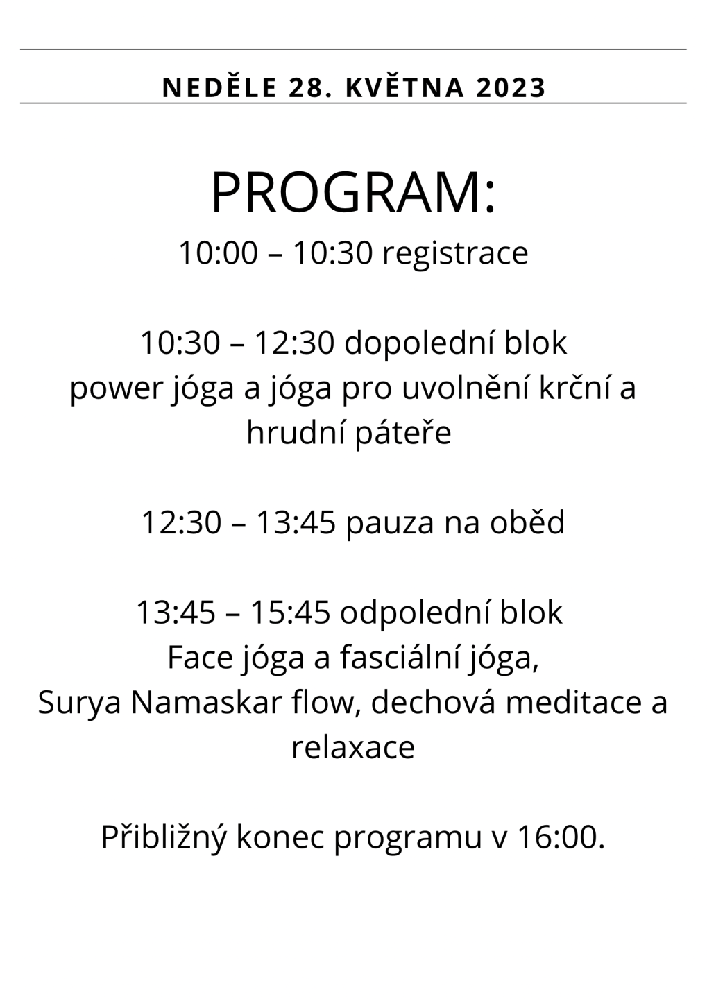 10:30 - 12:30 dopolední blok (power jóga a jóga pro uvolnění krční a hrudní páteře)