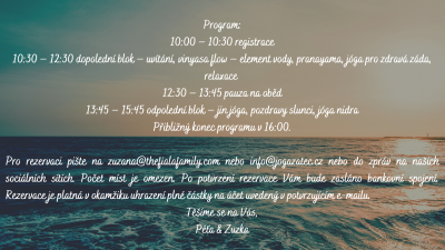 10:30 – 12:30 dopolední blok – uvítání, vinyasa flow – element vody, pranayama, jóga pro zdravá záda, relaxace